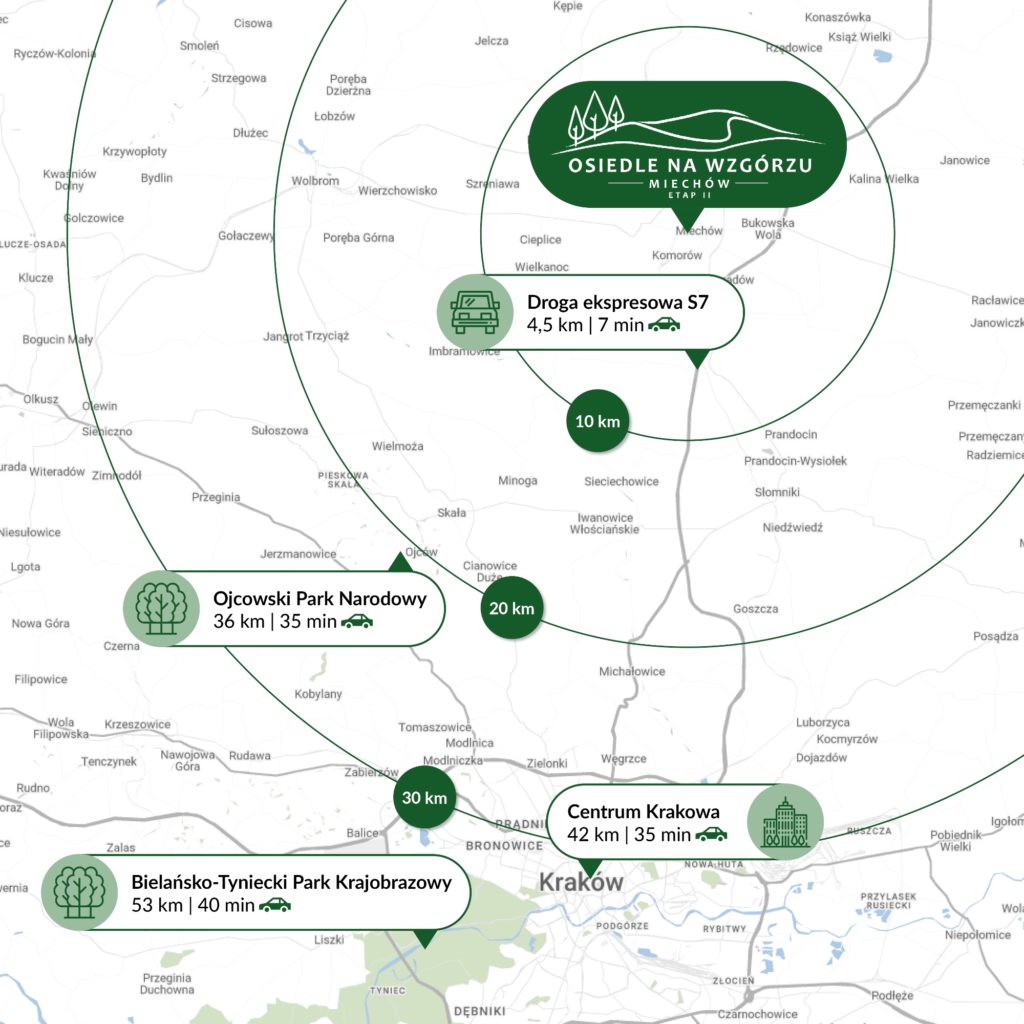 Mieszkając na Osiedlu Na Wzgórzu, masz w zasięgu ręki wygodne połączenia z Krakowem i całą okolicą. Droga ekspresowa S7, a także bliskość dworca kolejowego oraz przystanku autobusowego sprawiają, że szybko dotrzesz zarówno do pracy, jak i na weekendowy wypad. Oszczędzasz czas na dojazdach, a same podróże stają się prostsze i przyjemniejsze – niezależnie od tego, czy wybierasz się do miasta, czy na łono natury.