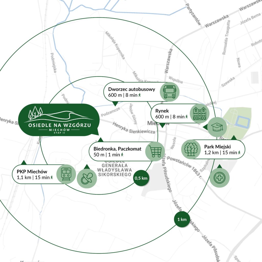 Osiedle Na Wzgórzu zlokalizowane jest przy ul. Daneckiej w Miechowie. To ścisłe, ale spokojne centrum miasta. Sklepy, restauracje, szkoły, banki, basen, siłownia – wszystko masz w promieniu kilku minut spacerem. Chcesz odpocząć? Park Miejski z placem zabaw i alejkami – idealne miejsce na spacer wśród zieleni i zabawę dla najmłodszych. W weekend możesz wpaść na lody na rynek albo spędzić popołudnie w jednej z lokalnych kawiarni. To połączenie miejskich udogodnień z możliwością złapania oddechu w zielonym otoczeniu, gdzie każdy dzień może być dokładnie taki, jak chcesz.